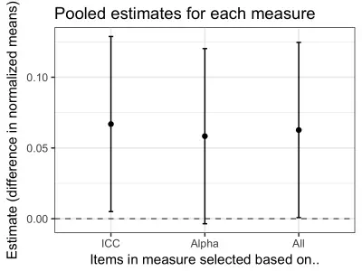 Below I present alternate specifications estimated without pooling. These specifications suggest first that replication 2 (as well as the original study) was not well-powered. It also suggests that the outcome measures with more items yield more reliable estimates.