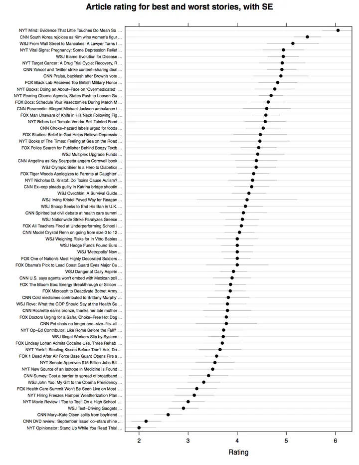 In addition, dot plots have aesthetic advantages. They convey the numerical estimate in question with a single one-dimensional point, rather than a two dimensional bar. There’s simply less that the eye needs to process. Accordingly, if a pattern across qualitative groupings exists, it’s often easier to see with a dot plot. For example, below I plot the average user ratings for each article to which Sean Westwood and I exposed subjects in a news reading experiment. The pattern that emerges is an “S” curve in which one or two stories dominate the ratings, most are sort of average, and a few are uniformly terrible. Note that you’d probably want to use something like this more for yourself than to communicate your results to others as it might overload your audience with too much information–you’d do better to select a subset of these articles or remove some of the ones in the middle (thanks to Yph Lelkes for making this point).